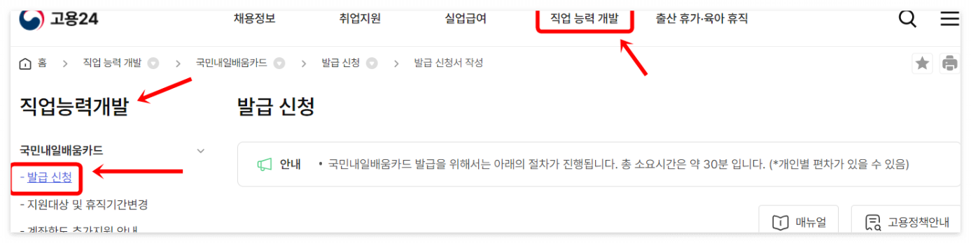 고용 24 로그인 후👉🏼직업능력개발 👉🏼국민내일배움카드 👉🏼발급신청 순서로 클릭 하시면 됩니다.