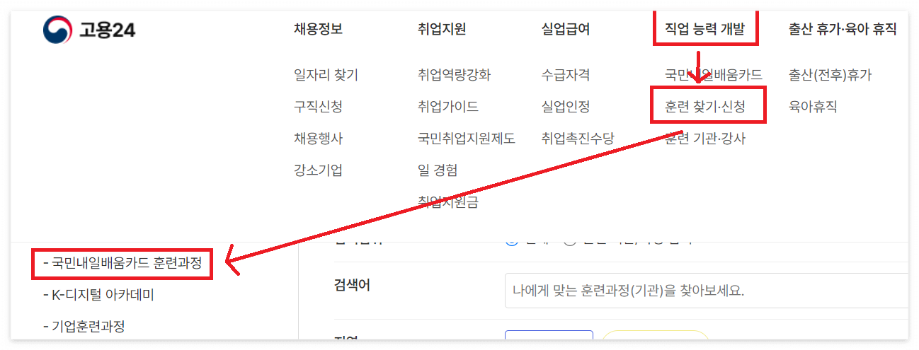 직업 능력 개발 👉🏼 훈련 찾기 신청 👉🏼 국민내일배움카드 훈련과정 순서